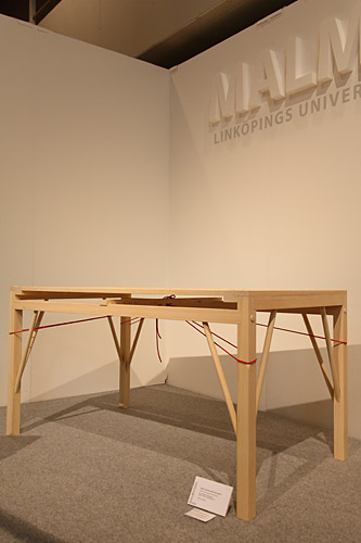 マルムステンCTDの家具デザイン科の学生が考案した机です。実はこれ、接着が全く行われていません。それでいて十分な強度が出るように考えられています。通常は思いつかない手法ですが、家具の構造などを深く理解する為にはとても良いですね。 |