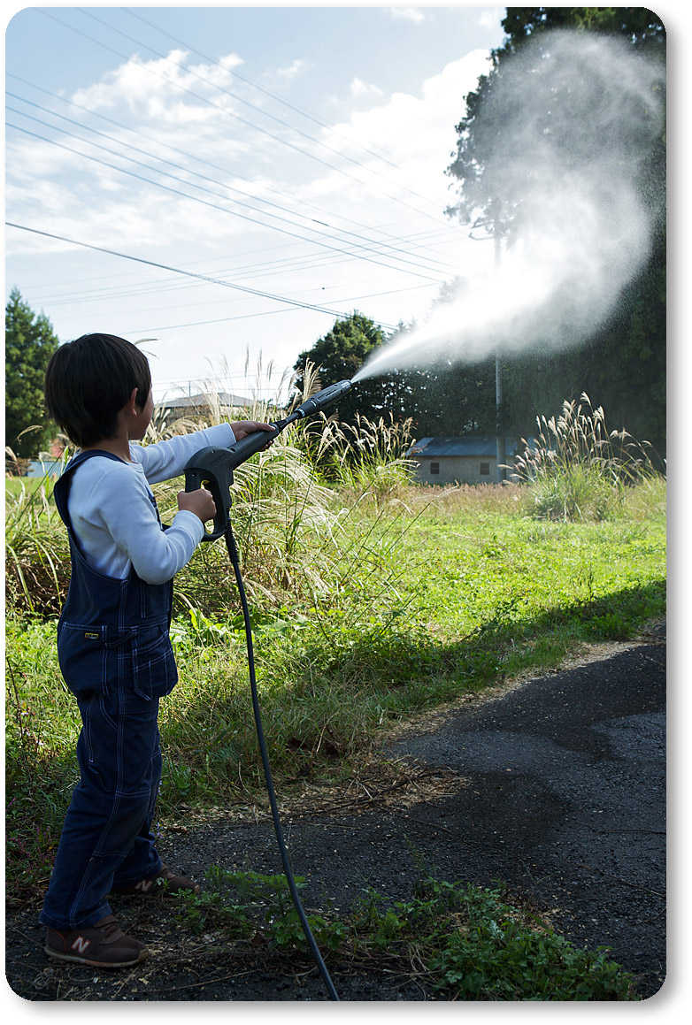 注:高圧洗浄機は強力なので、色々とルールを定めて触らせています。
