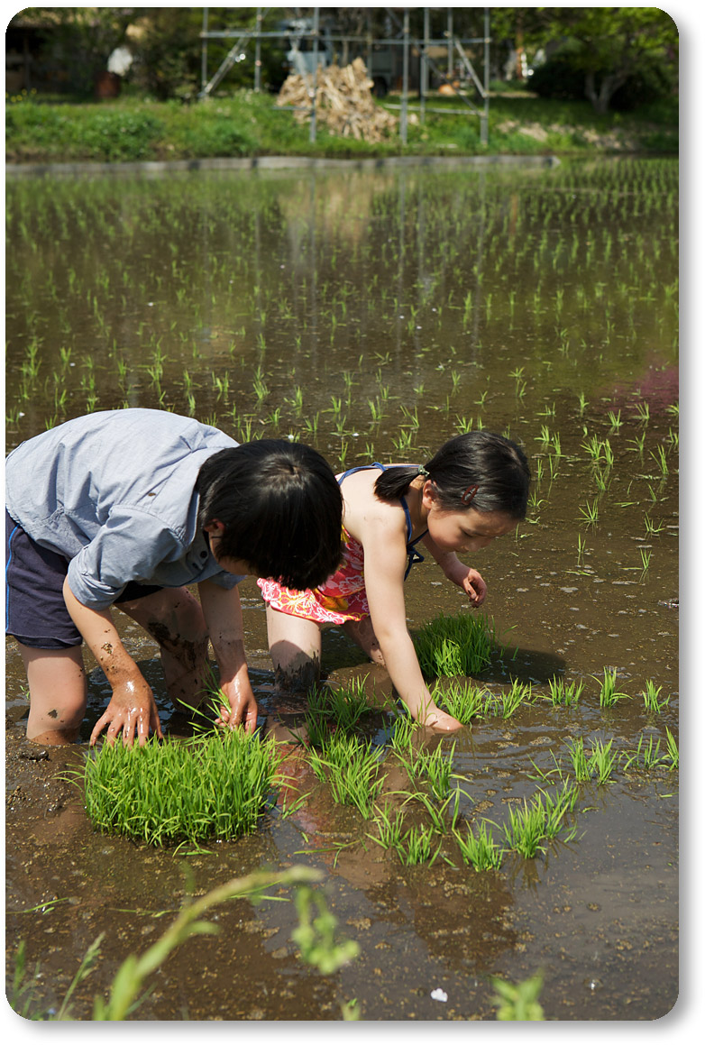 目の前に広がる田んぼの一部を使わせてもらって、家族揃って作付けに挑戦!子供たちだけでなく、僕たちも初めての体験です。