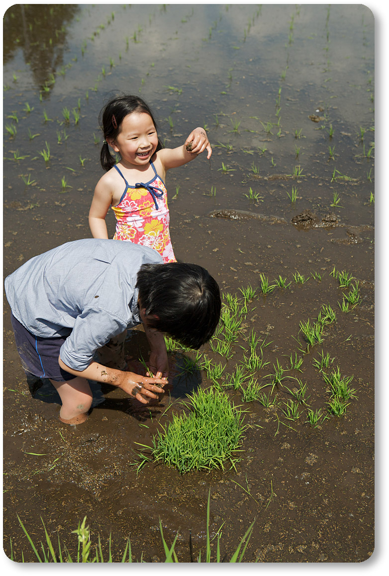 子供も親も一緒にどろんこになっての田植え、よいですねえ!最高ですね!