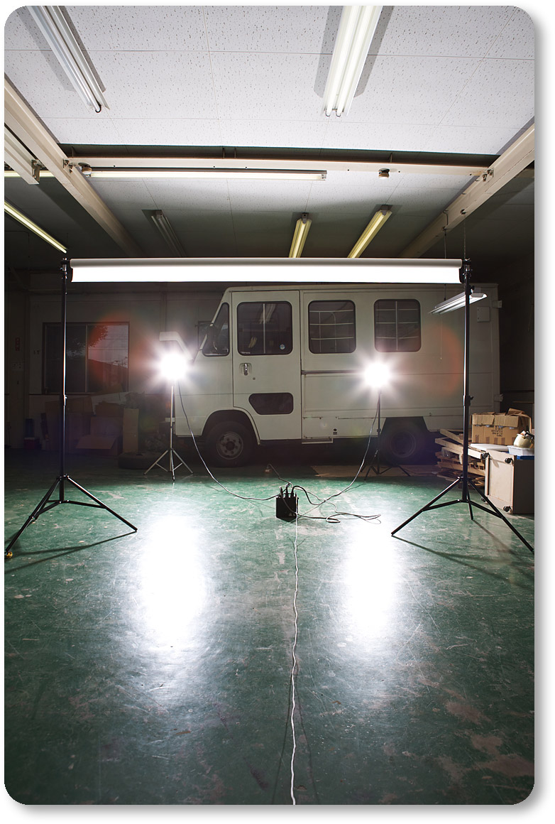 やっと準備が整った照明セット。車の前にフラッシュが立っています。手前にあるのは背景紙などをつるすスタンド。今回は普通の背景紙ではなくて、違う紙を使います。