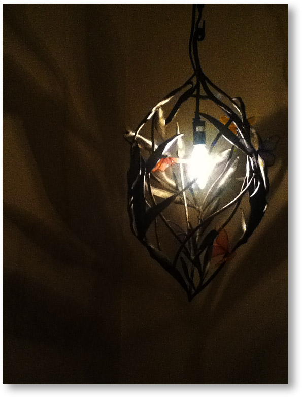 繊細な蝶がとまっている籠状のランプ。(注)影以外の黒い部分が、鉄です。