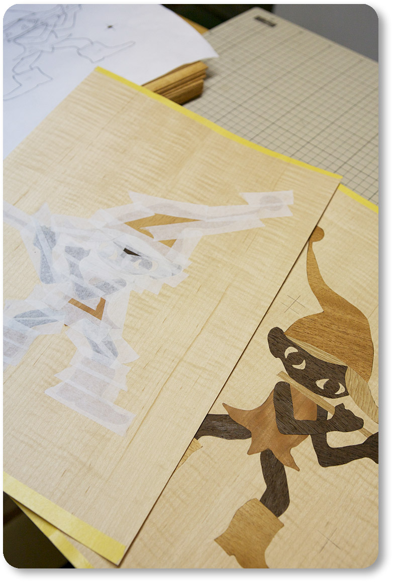 そうやって出来上がったのがこちら。藤城清治さんのこびとがモチーフの象嵌(ぞうがん)パネルです。おおよそA3の大きさ。