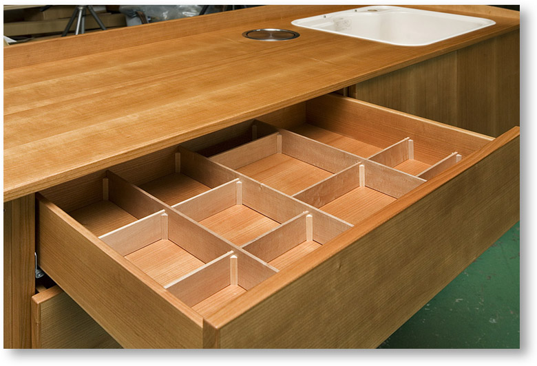食器用の仕切りを備えた引き出し一段目。下段はリネン類の収納です。