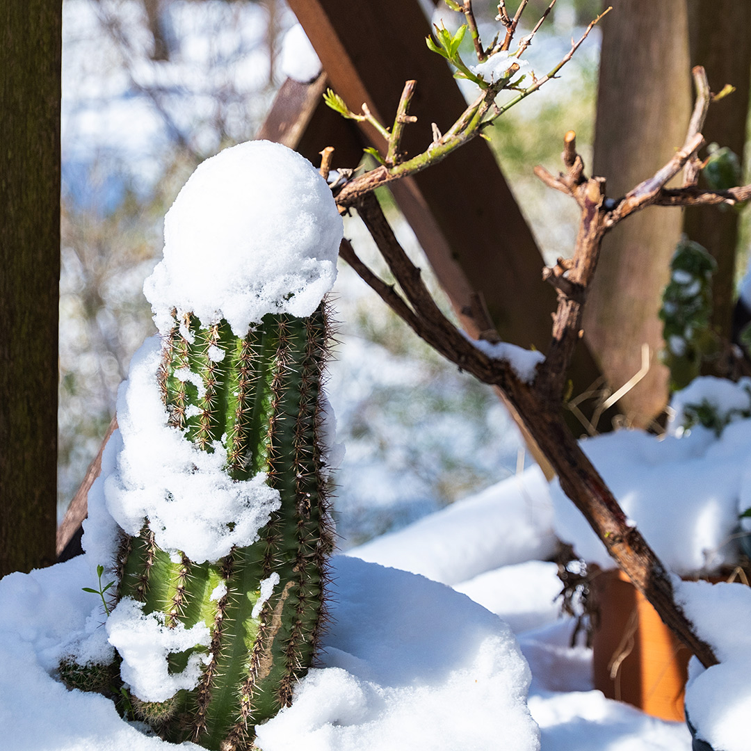 窓を開けたら、まさかの積雪。 春の新芽が出てきていたバラも、サボテンにも雪が!